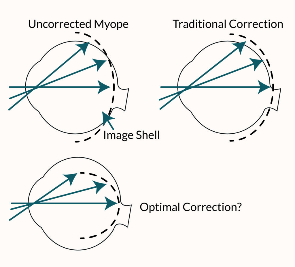 Specially-designed myopia management glasses provide peripheral defocus that reduce eye elongation and the worsening of myopia.
